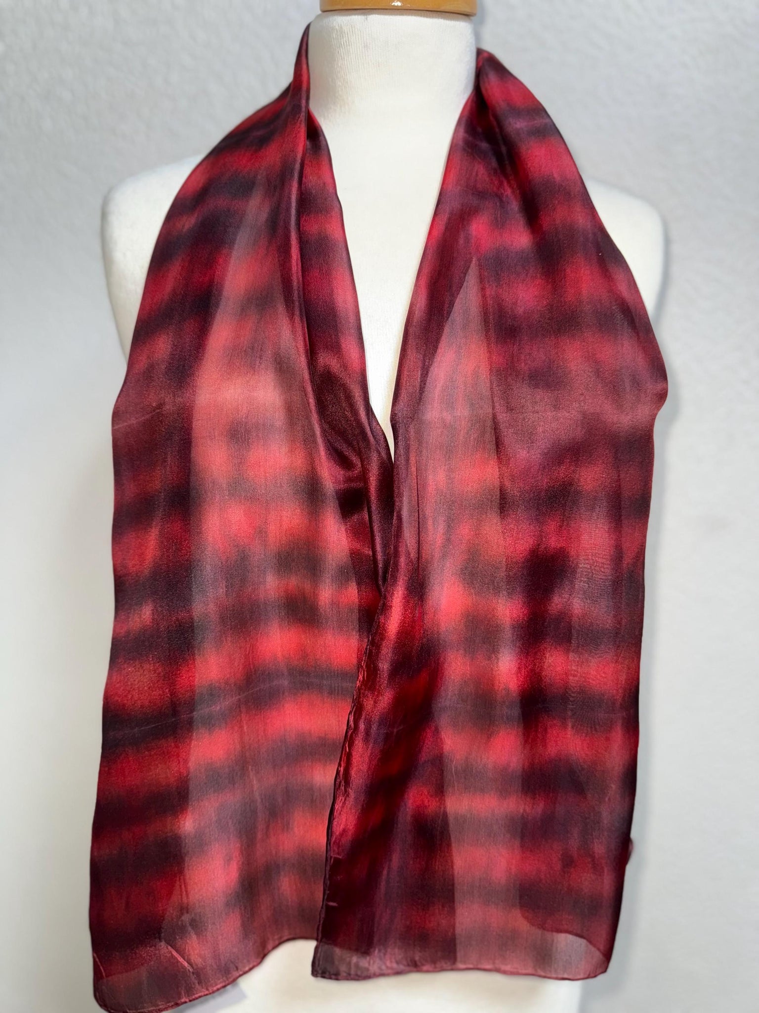 This scarf started as a piece of white silk. The dyes were chosen and mixed especially for this scarf to transform it into a piece of art. I use various different types of dye and dying techniques to create the different effects that make these scarves so special. It is hand hemmed and finished with the addition of a Designer Silk label.