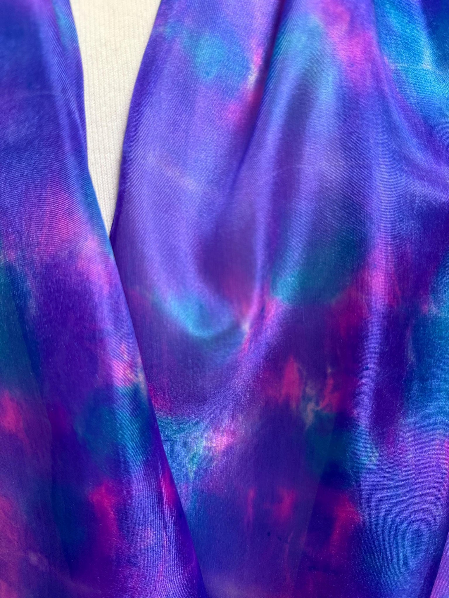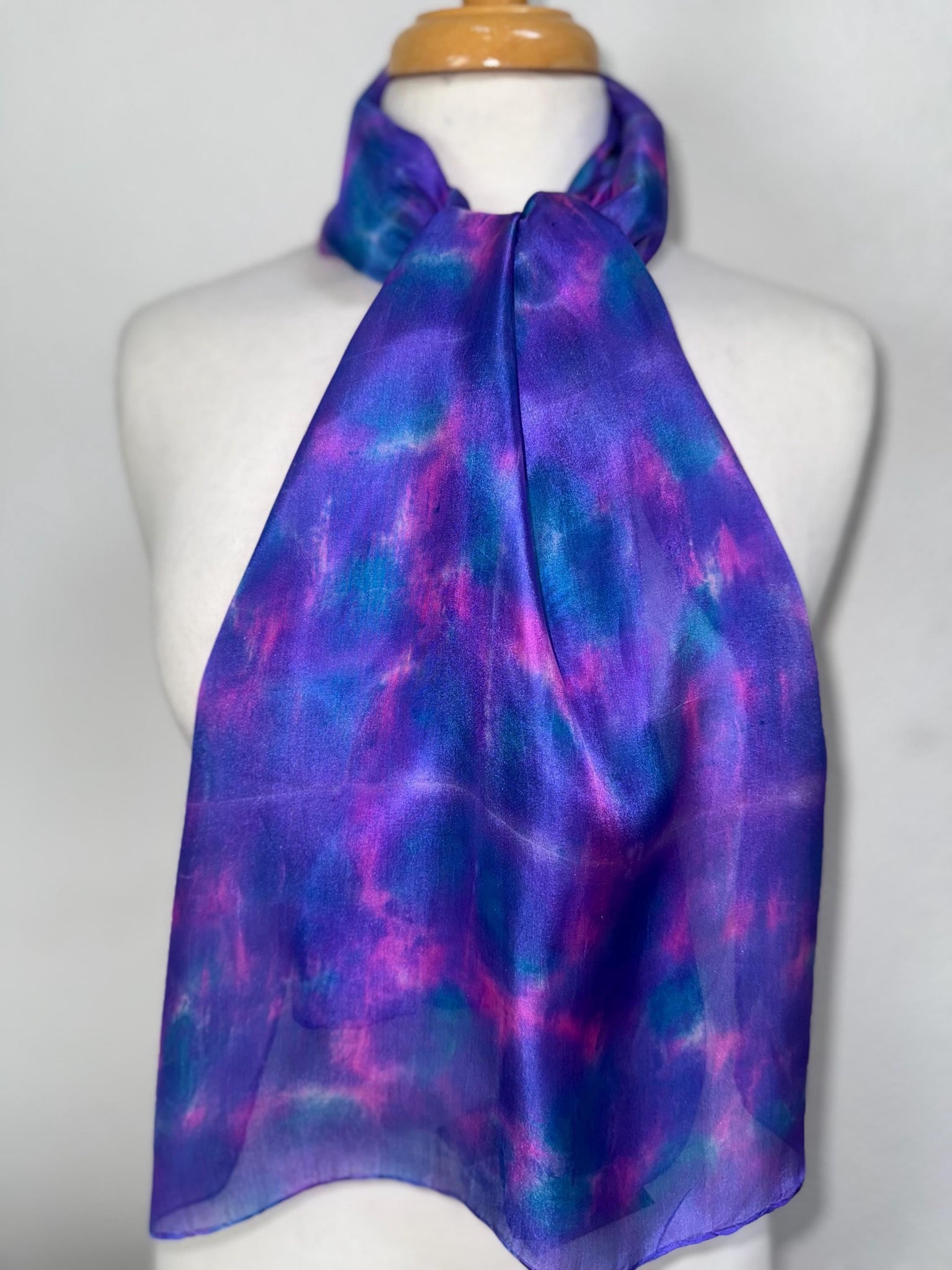 This scarf started as a piece of white silk. The dyes were chosen and mixed especially for this scarf to transform it into a piece of art. I use various different types of dye and dying techniques to create the different effects that make these scarves so special. It is hand hemmed and finished with the addition of a Designer Silk label.