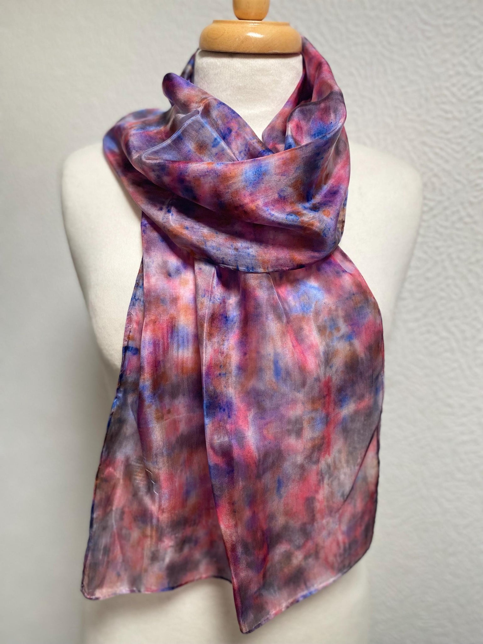 This scarf started as a piece of white silk. The dyes were chosen and mixed especially for this scarf to transform it into a piece of art. I use various different types of dye and dying techniques to create the different effects that make these scarves so special. It is hand hemmed and finished with the addition of a Designer Silk label.