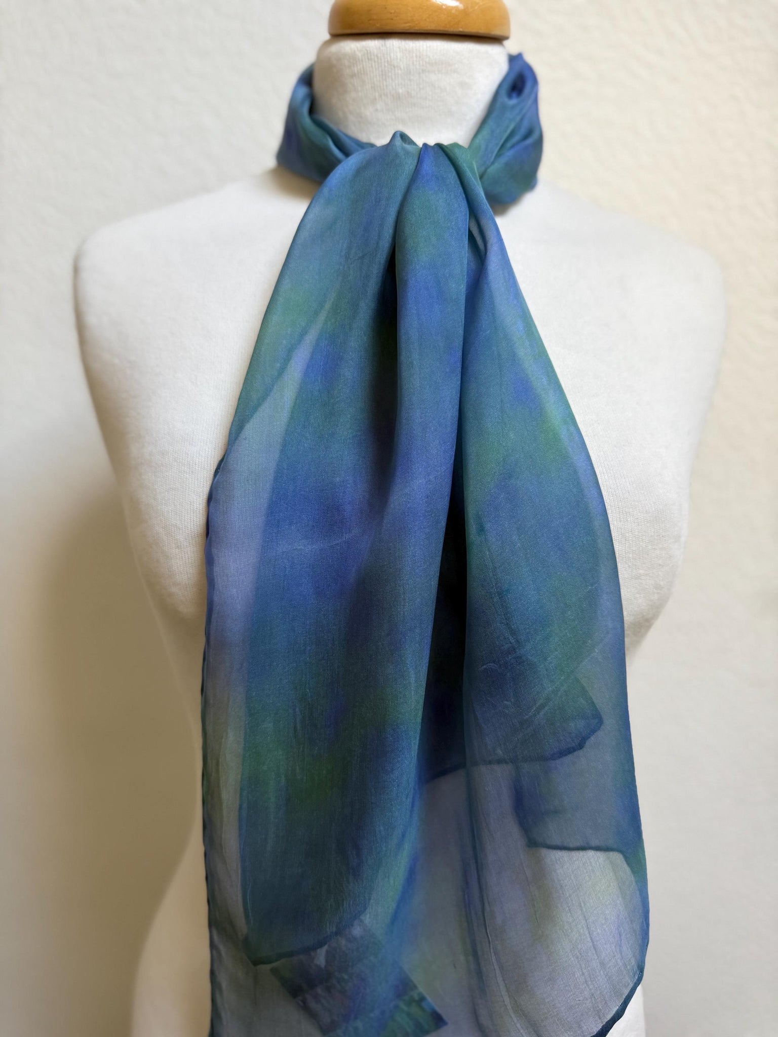 This scarf started as a piece of white silk. The dyes were chosen and mixed especially for this scarf to transform it into a piece of art. I use various different types of dye and dying techniques to create the different effects that make these scarves so special. It is hand hemmed and finished with the addition of a Designer Silk label.