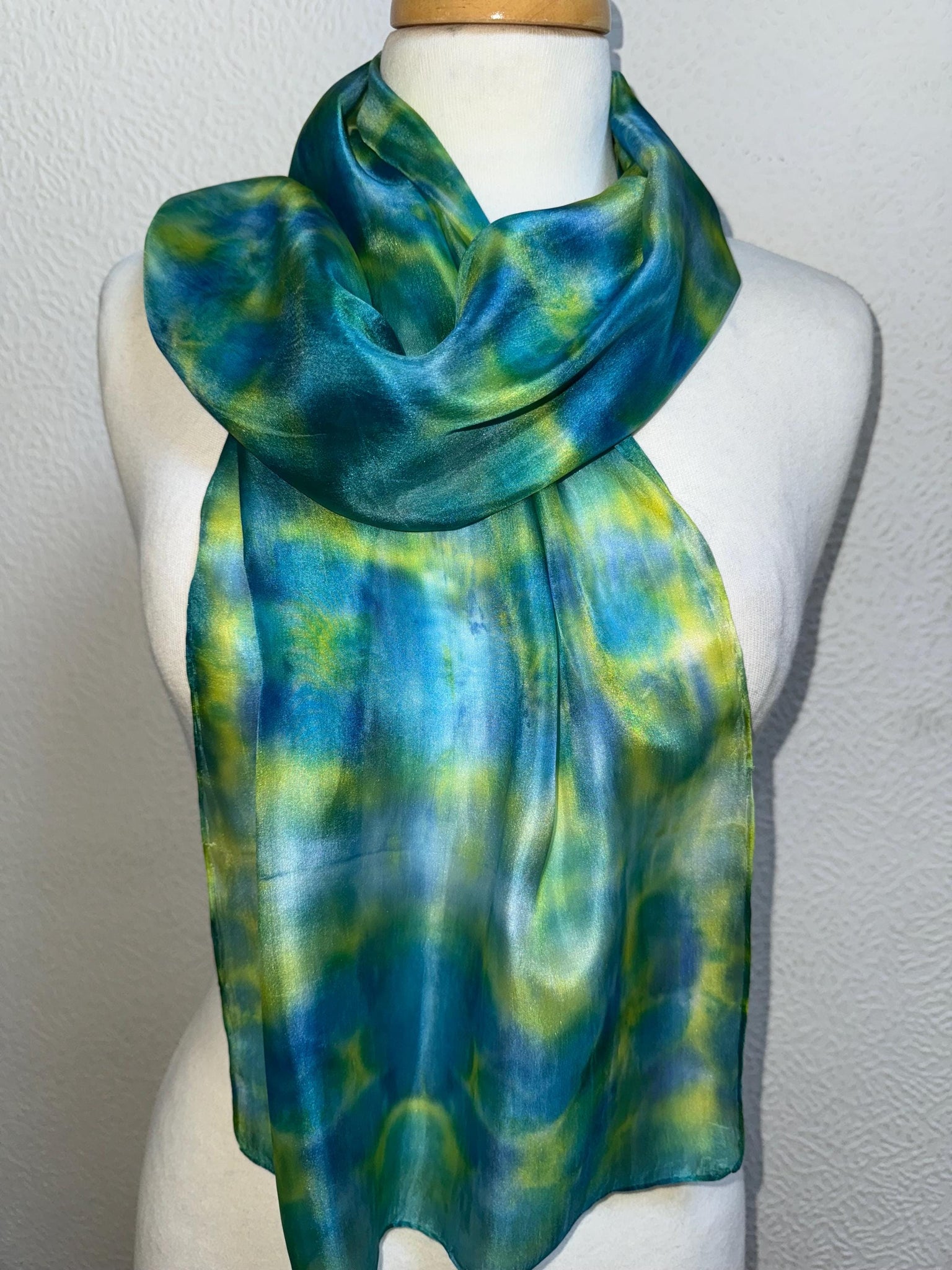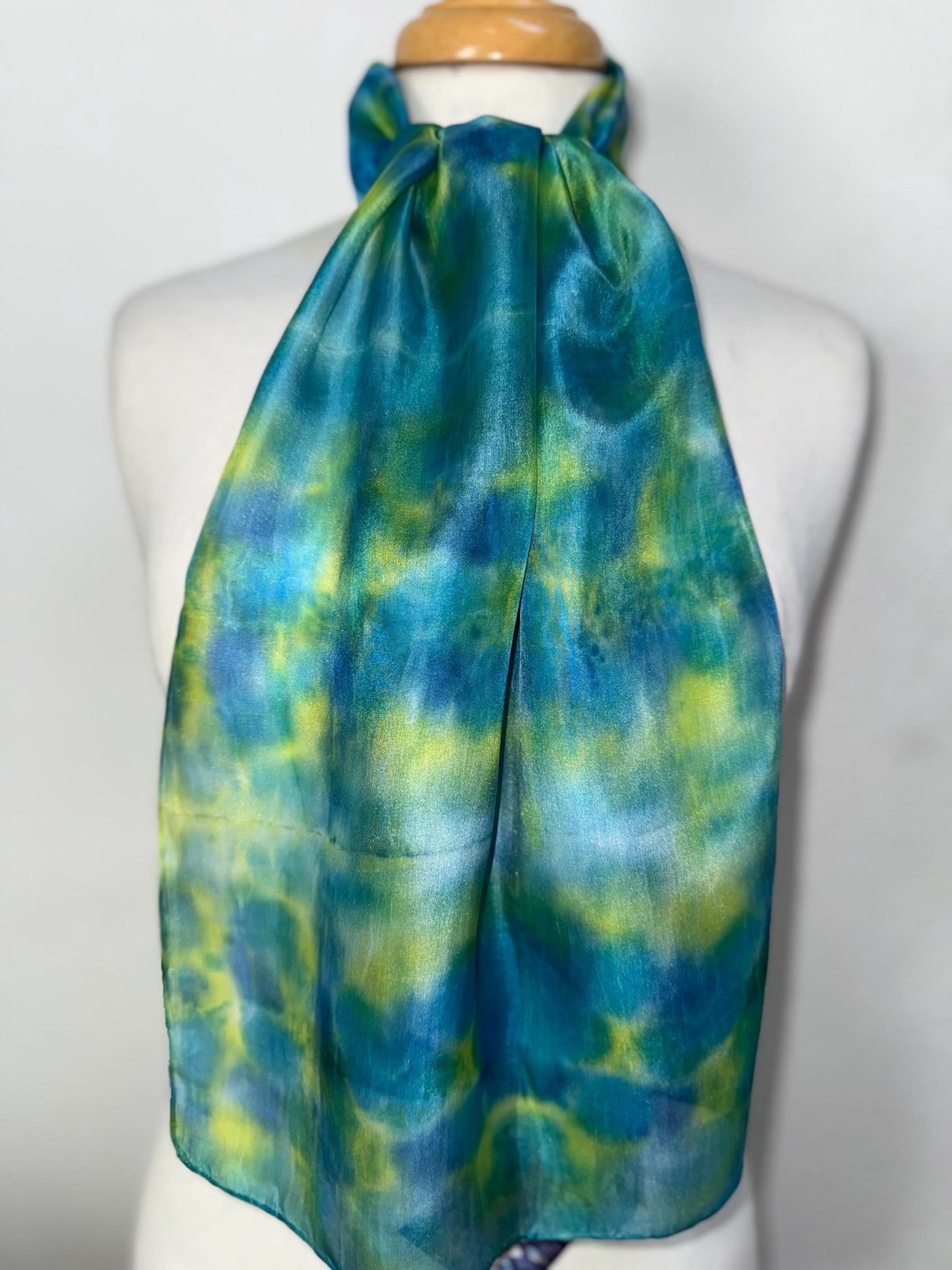 This scarf started as a piece of white silk. The dyes were chosen and mixed especially for this scarf to transform it into a piece of art. I use various different types of dye and dying techniques to create the different effects that make these scarves so special. It is hand hemmed and finished with the addition of a Designer Silk label.