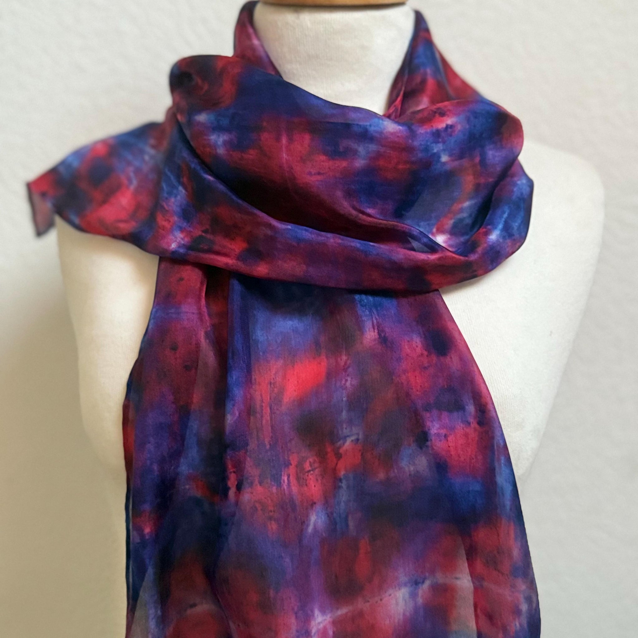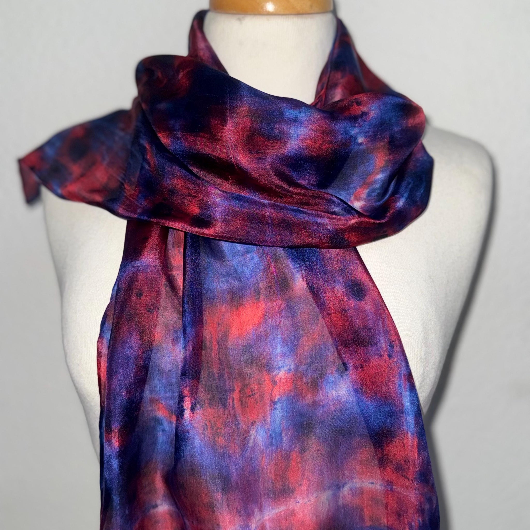 This scarf started as a piece of white silk. The dyes were chosen and mixed especially for this scarf to transform it into a piece of art. I use various different types of dye and dying techniques to create the different effects that make these scarves so special. It is hand hemmed and finished with the addition of a Designer Silk label.