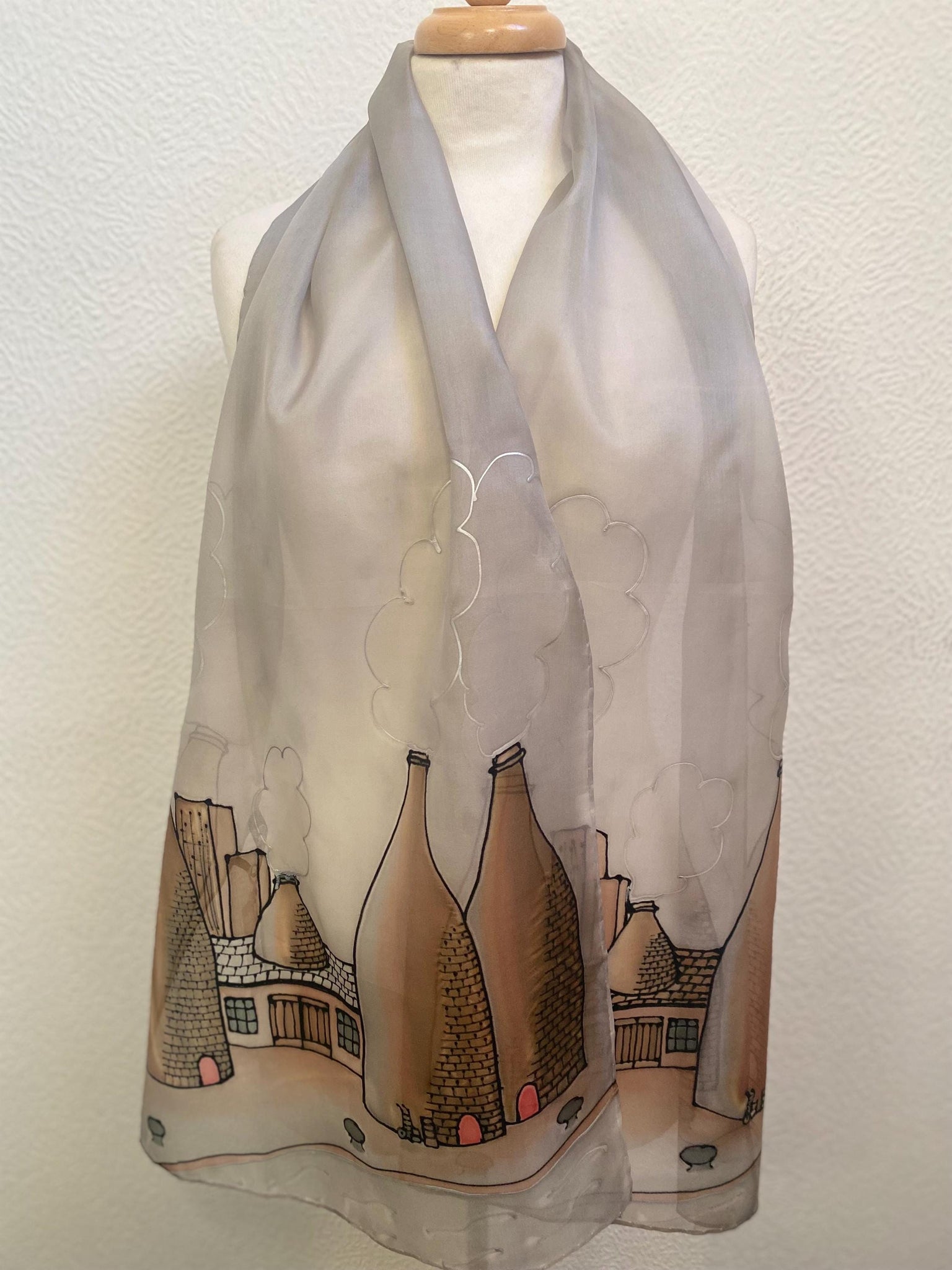 Potteries Design hand drawn & painted silk x long scarf by Designer Silk.