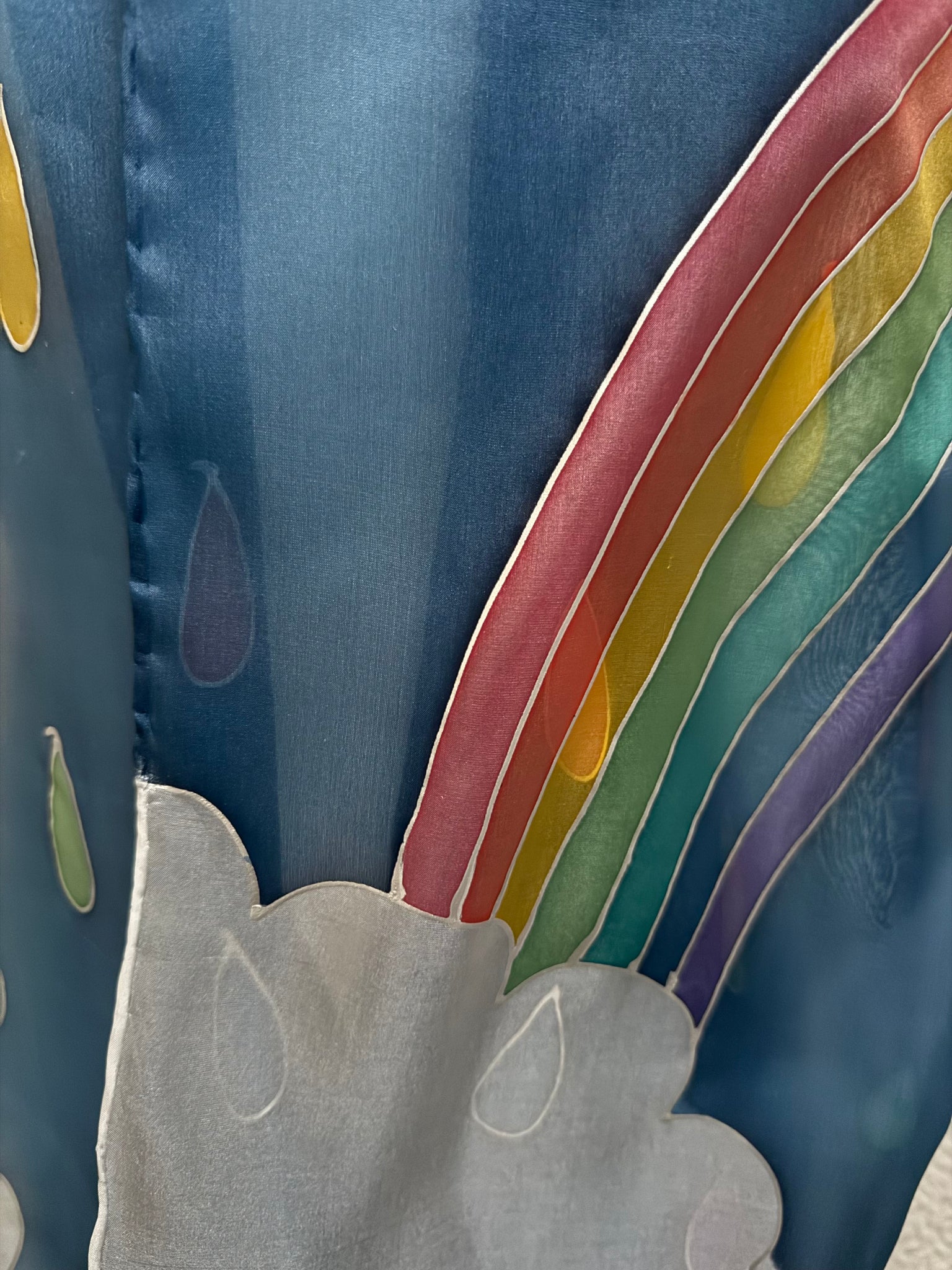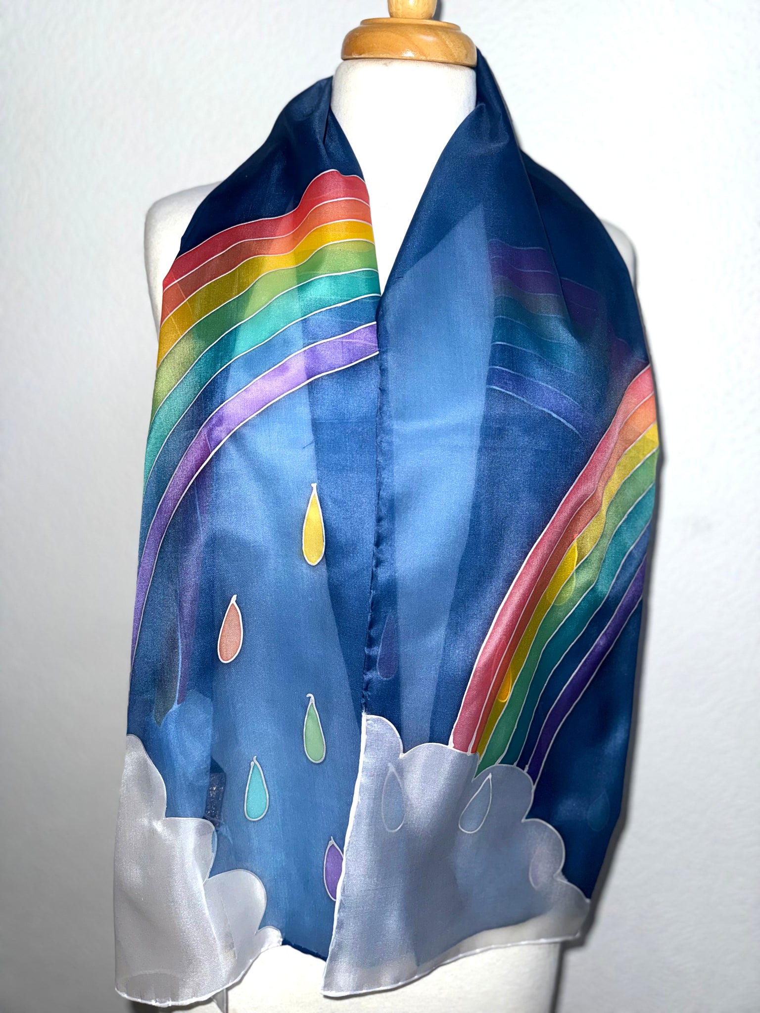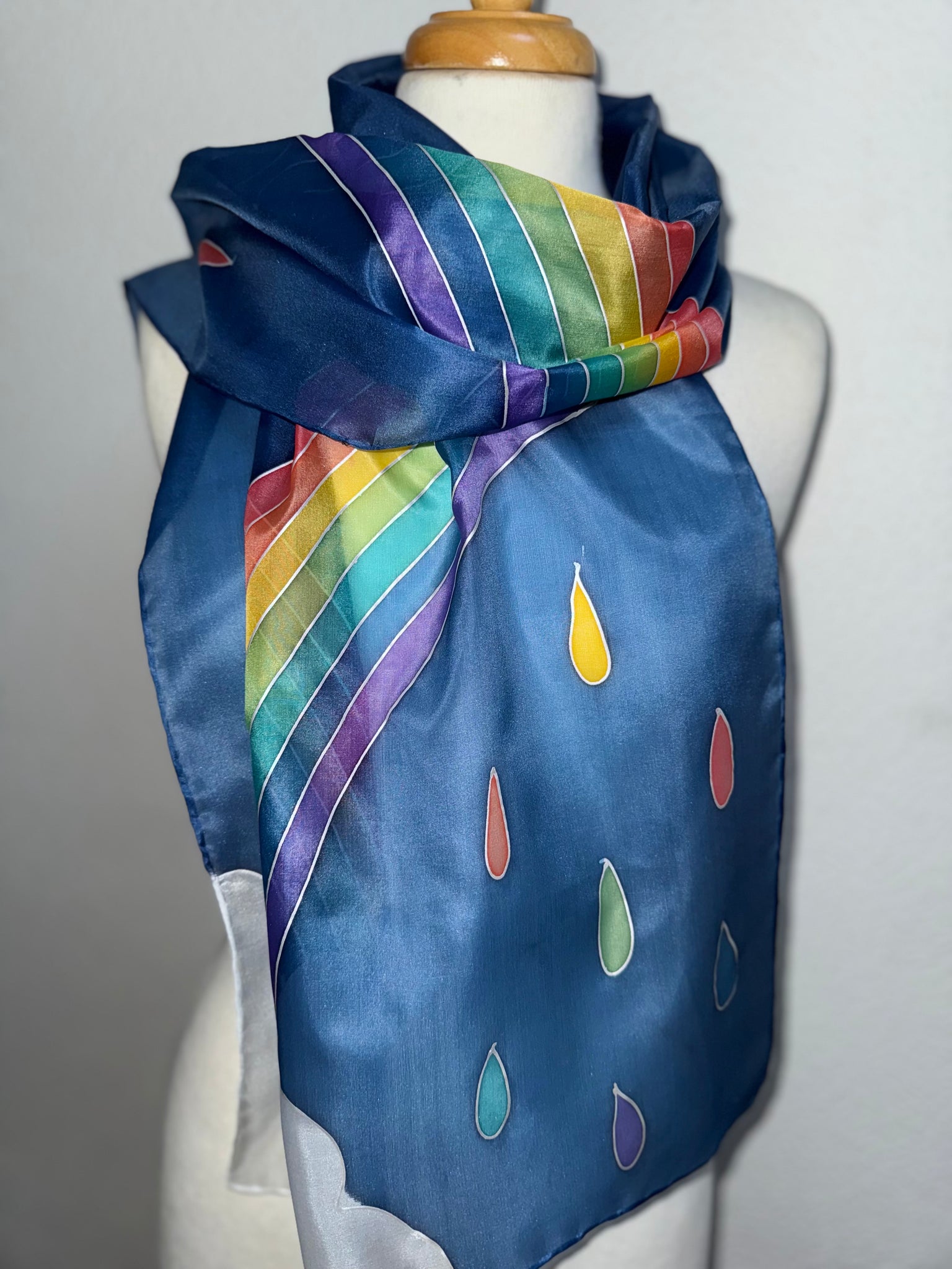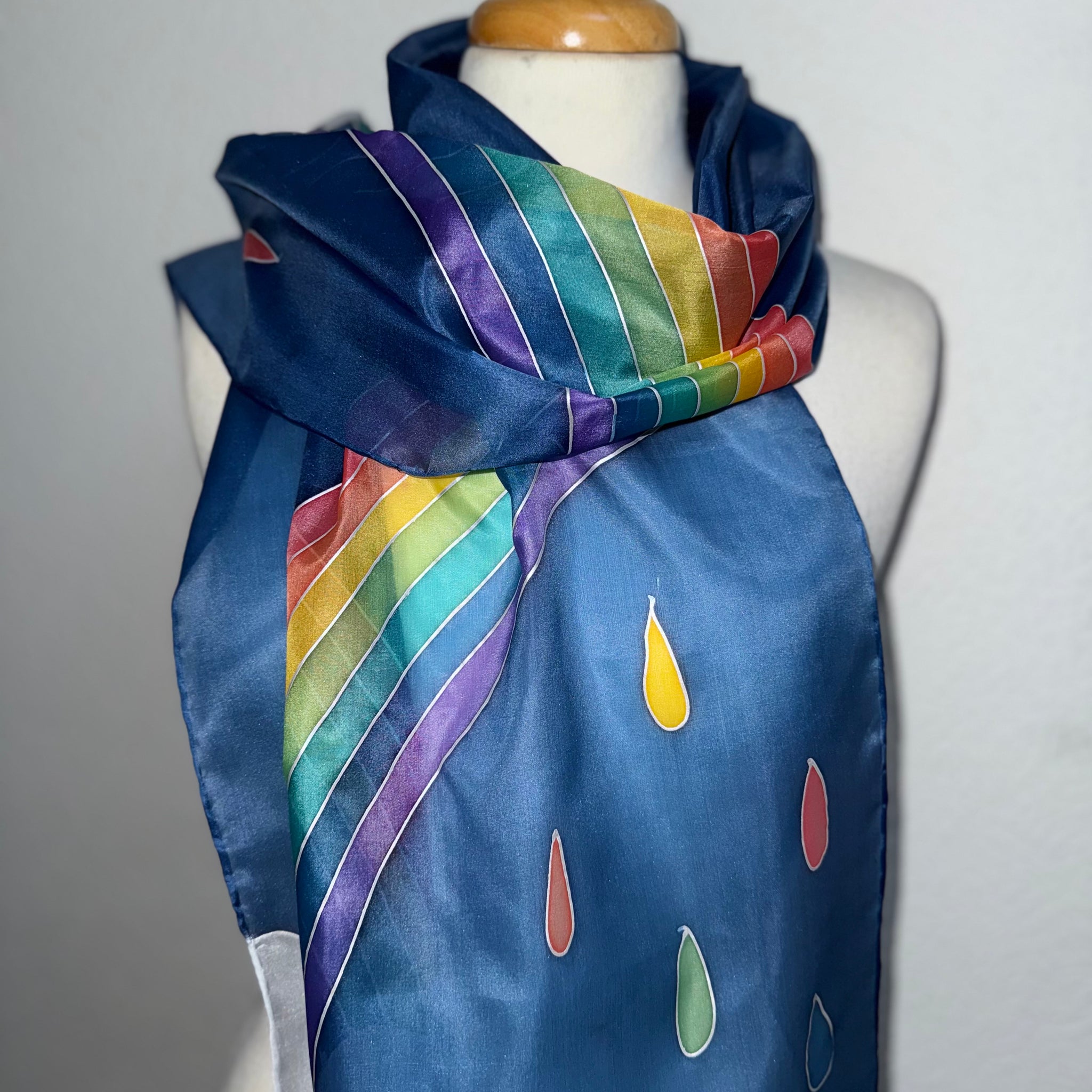 This scarf is individually hand drawn and painted. It starts as white silk and is painted using the serti technique of silk painting. It is hand hemmed and finished with the addition of a Designer Silk Artist label.
