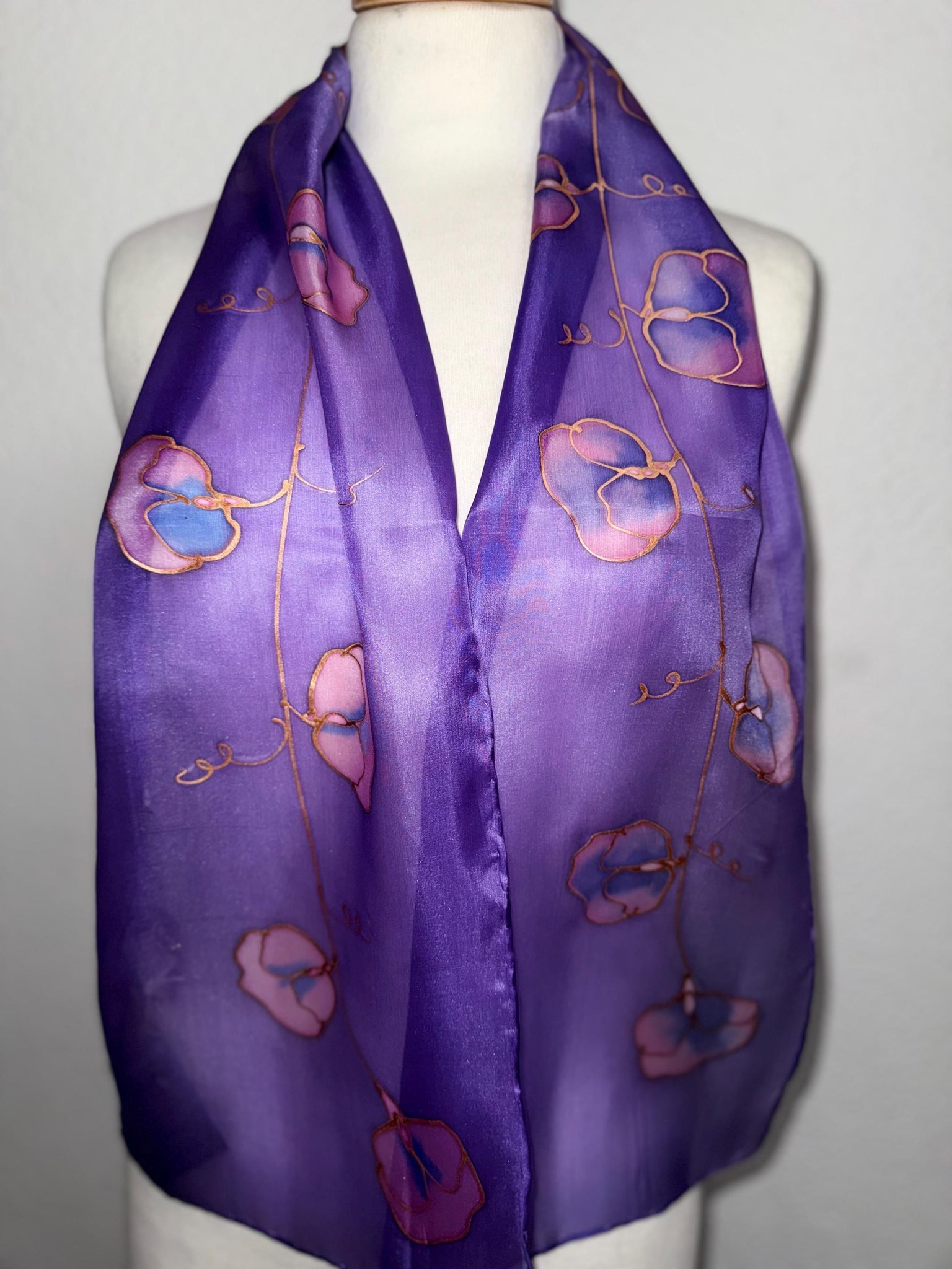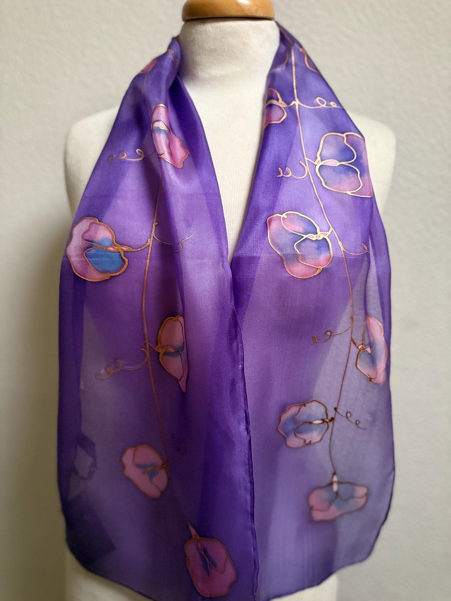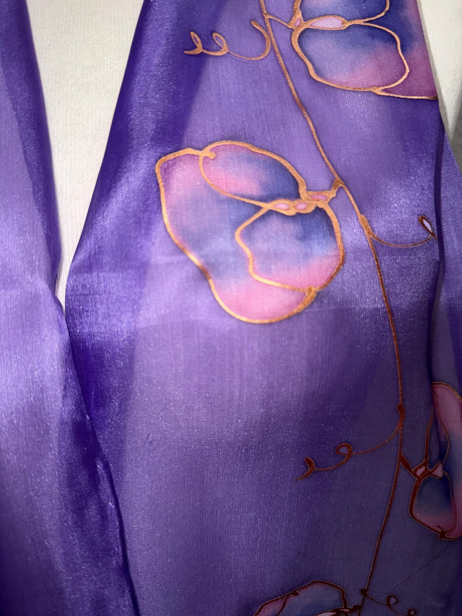 Sweet Peas Design hand drawn & painted silk neck scarf by Designer Silk Artist.