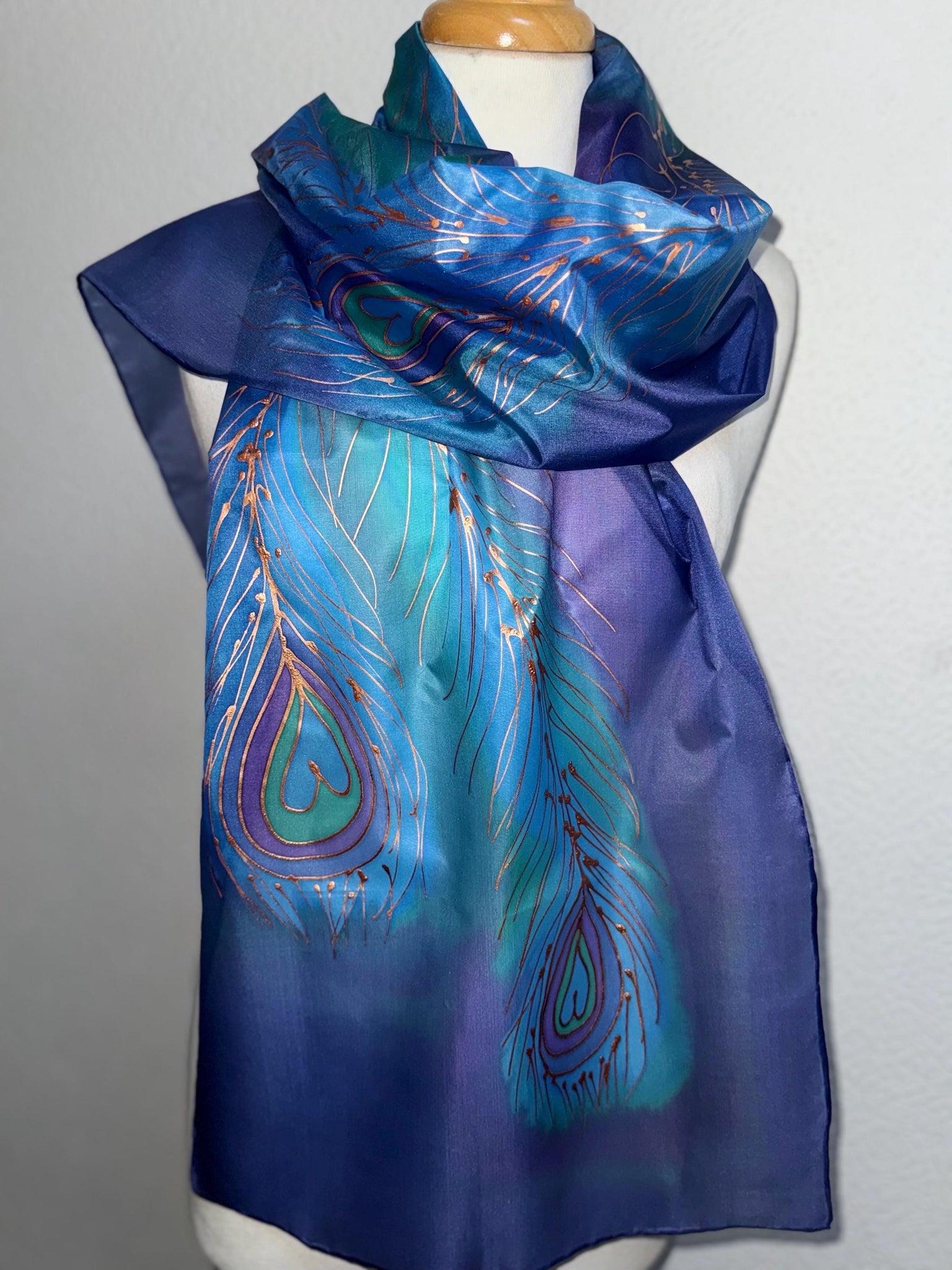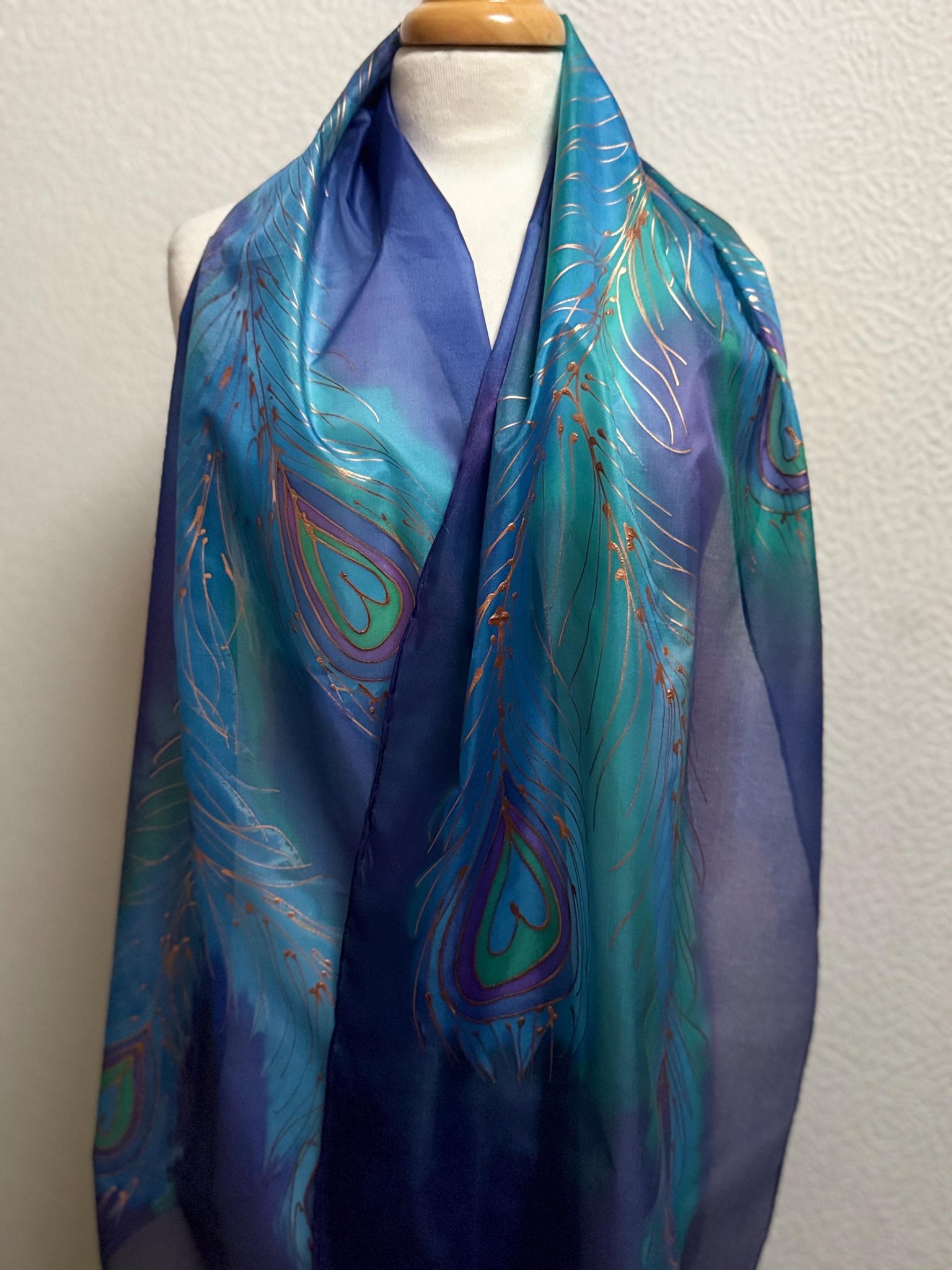 Peacock Feathers Design X Long Silk Scarf in Blues and Jade : Hand Painted Silk